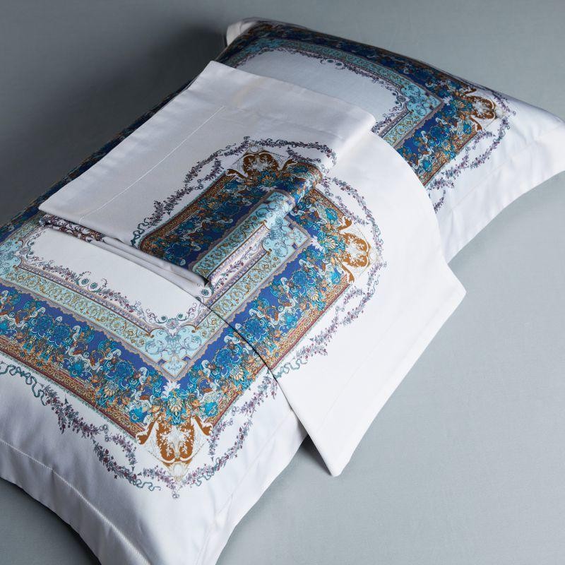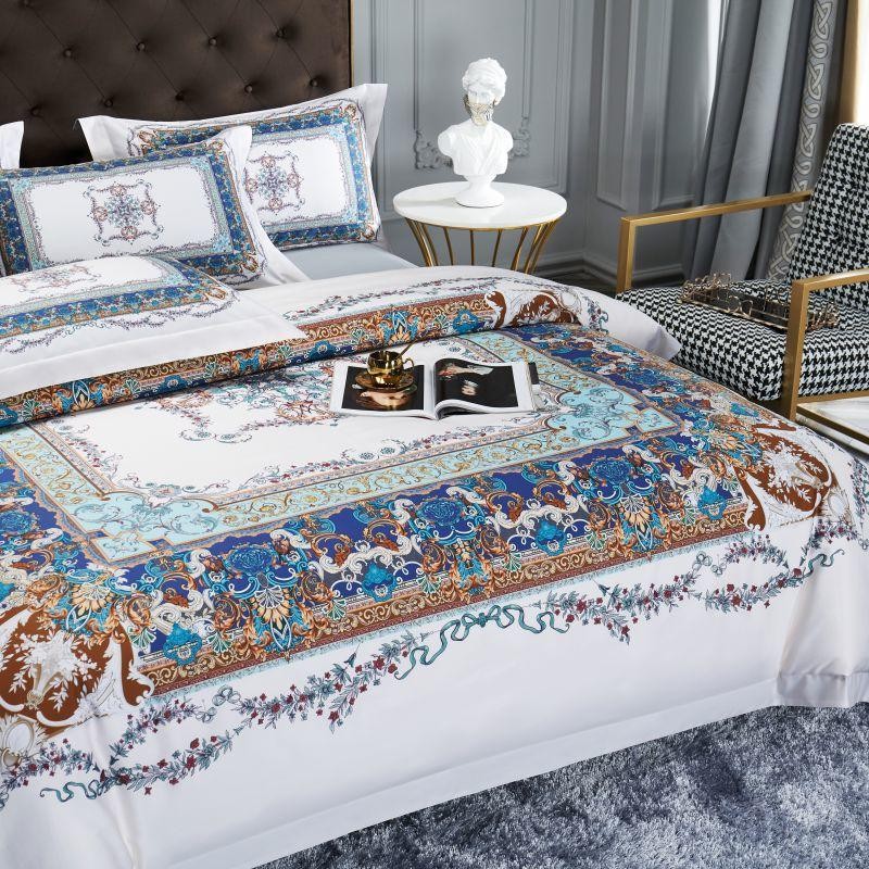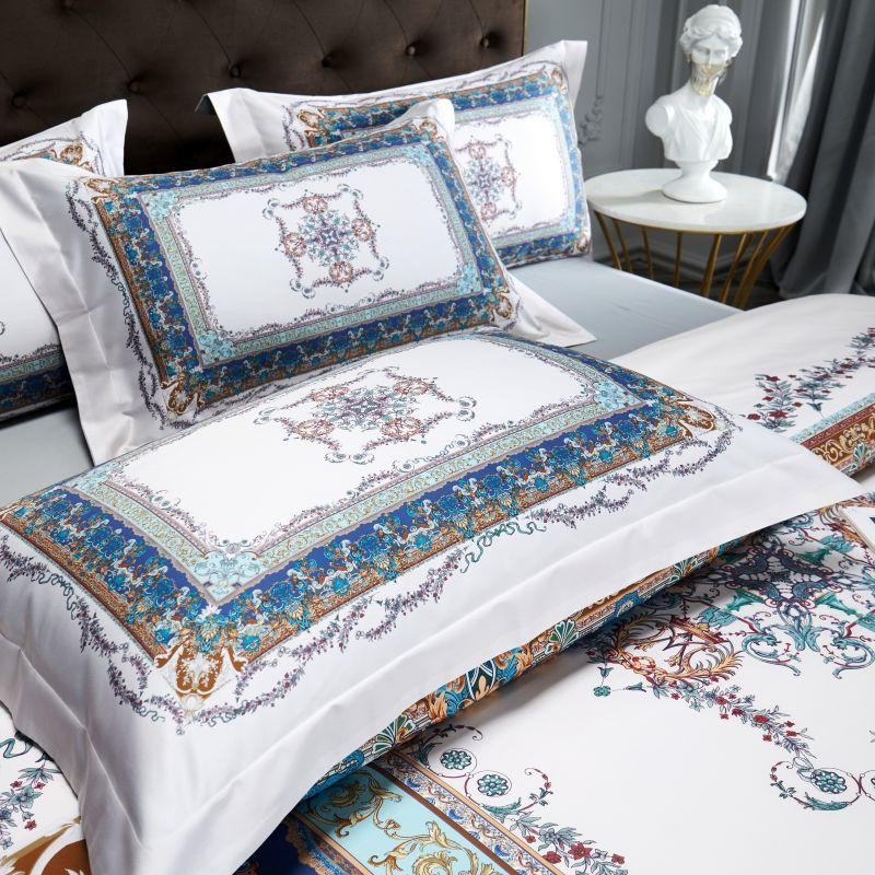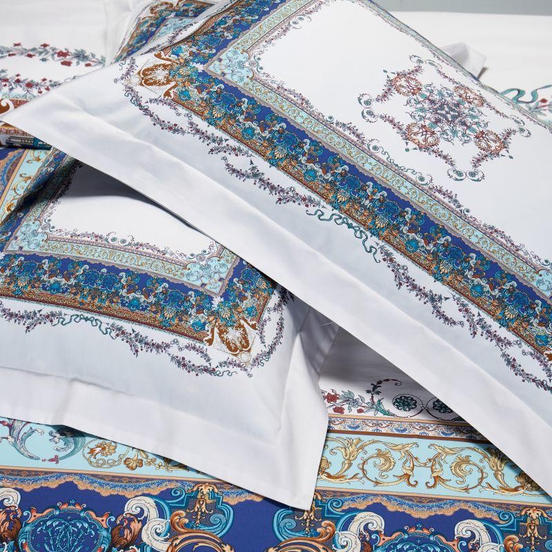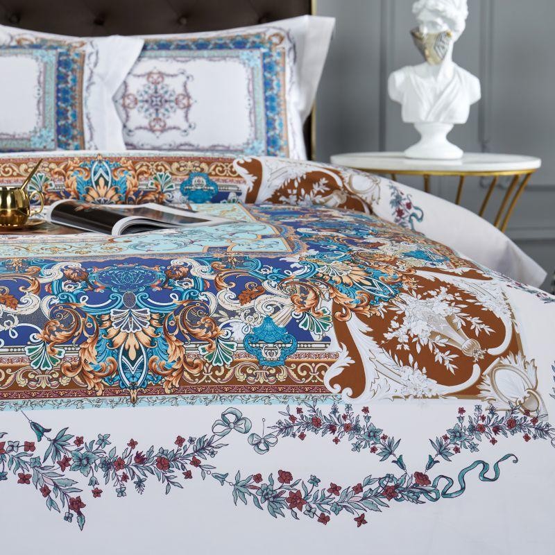 Bring a touch of easy opulence to your bedroom through our Ava Egyptian Cotton Duvet Cover Set. The printed border is brought to life through a mix of deep rich colors accented with a dainty floral wrap-around motif. The solid white base is utilized to ground the design and makes sure that each detail in this layered set stays sharp.